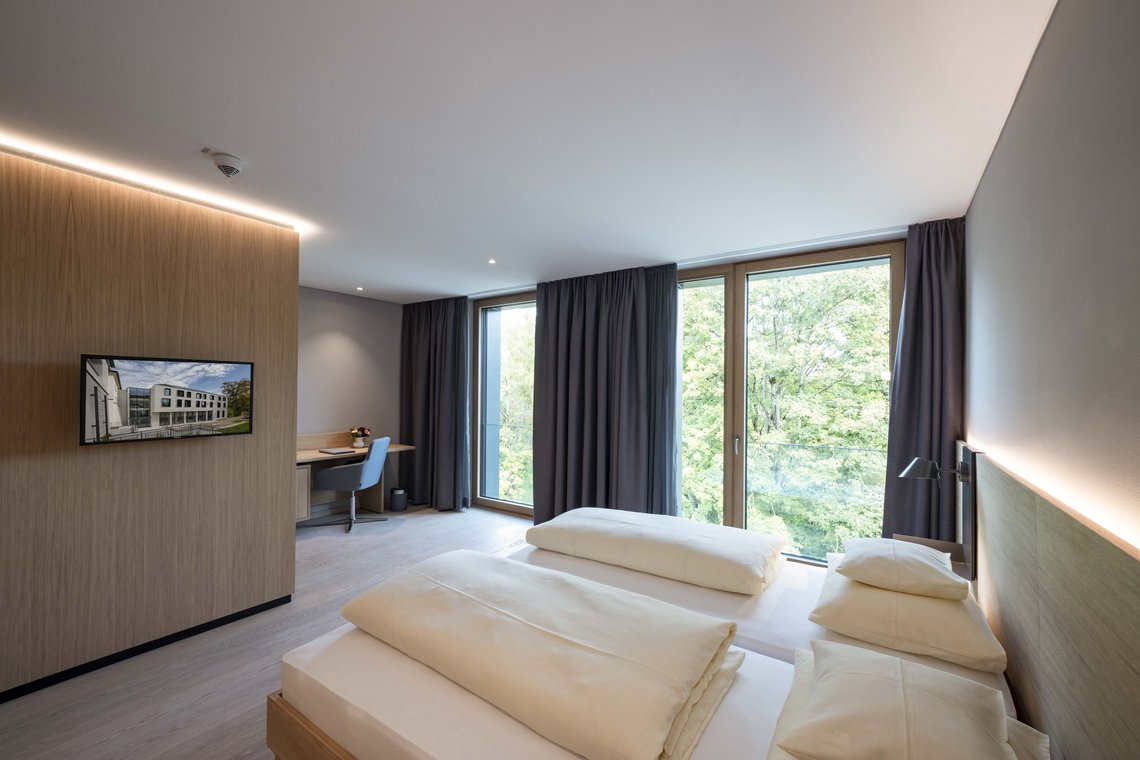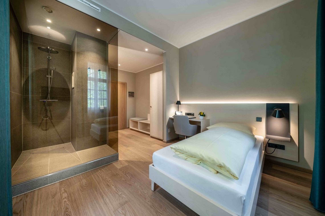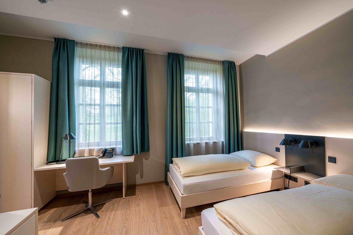 Alle Zimmer verbinden moderne Wohnlichkeit mit der Ruhe und Zurückgezogenheit des historischen Ambientes von Kloster Irsee. Bequeme Betten von 2,00 x 1,00 Metern Größe sind mit verstellbaren Lattenrosten ausgestattet. Die Einzelzimmer in der Küferei bieten für den erholsamen Schlaf sogar eine Bettengröße von 2,00 x 1,20 Metern. In allen Doppelzimmern können die Betten auf Wunsch zur Kingsize von 2,00 x 2,00 Metern verbunden werden.