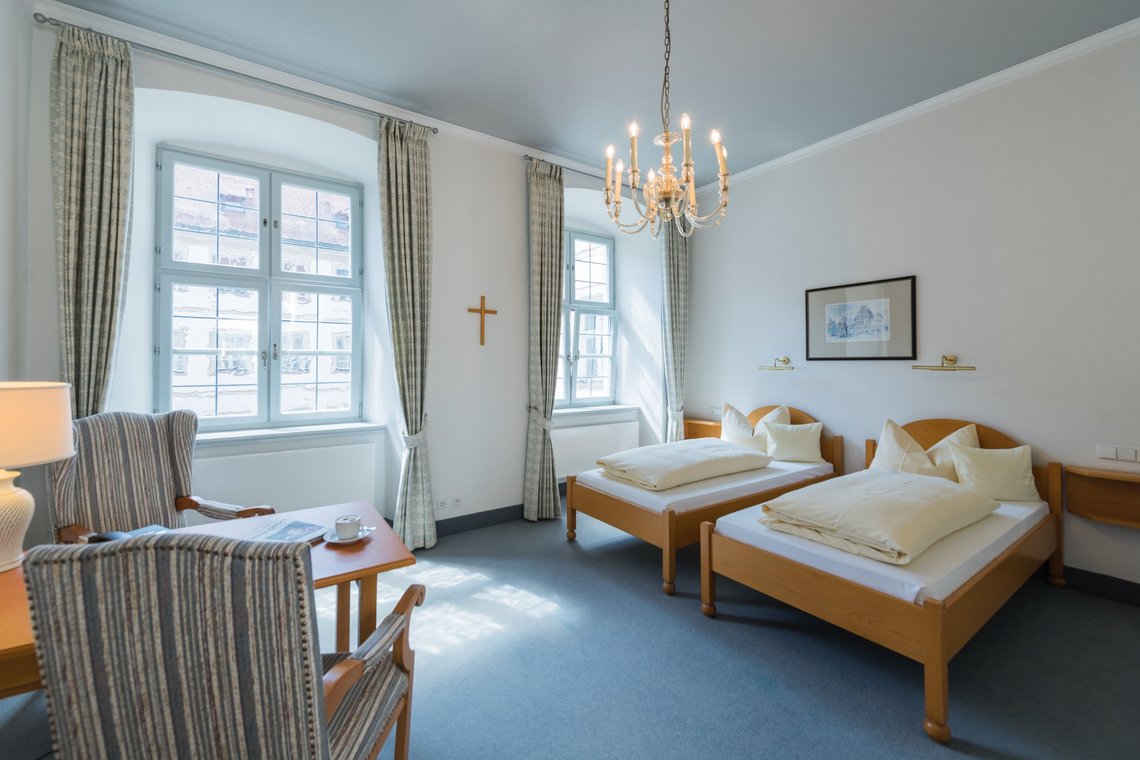 Alle Gästezimmer sind mit modernen Bädern (Dusche, vereinzelt Badewanne) und WC ausgestattet. Die hohen und lichten Räume bieten gediegenen Komfort (HD-Fernseher, Direktwahltelefon und Internetzugang per W-LAN, Ganzkörperspiegel, Zimmersafe, Fön) in klösterlichem Ambiente. Bei Anreise erhalten Übernachtungsgäste eine Flasche Mineralwasser als erfrischende Aufmerksamkeit.